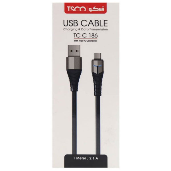 کابل TC C 186 برند تسکو 1 متر طول دارد و رشتههای مسی آن با استفاده از کنفی پوشانده شدهاند . این روکش مقاومت زیادی دارد و رشتههای مسی داخل کابل را در برابر قطعشدن براثر کشیدن ، خم شدن و گره خوردن مقاوم کرده است؛ کانکتورهای به کاررفته در این کابل TC C 186 بسیار مقاوم هستند. در یک سمت این کابل یک کانکتور Type C و در سمت دیگر آن یک کانکتور USB برای اتصال به شارژر و کامپیوتر برای انتقال اطلاعات وجود دارد. شما میتوانید از کابل TC C 186 برای شارژ و انتقال اطلاعات میان دستگاههای مختلف به راحتی استفاده کنید. این کابل حالت فنری دارد و به شدت کاربردی می باشد.